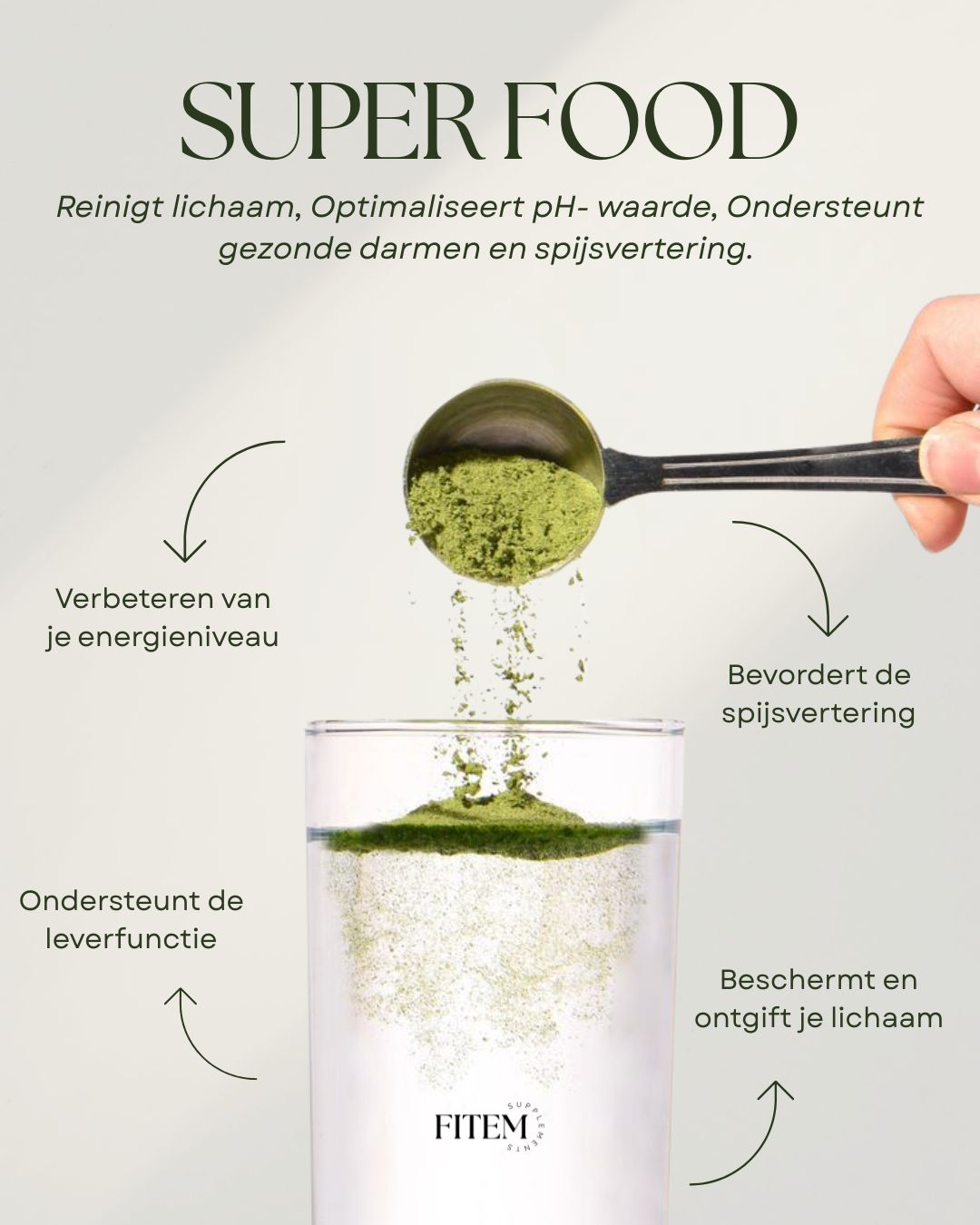 Super Food is een 100% natuurlijk supplement dat, Je lichaam ondersteunt bij het reinigen en ontgiften. Het Helpt de pH-waarde in balans te brengen. De spijsvertering bevordert en de essentiële voedingsstoffen levert.